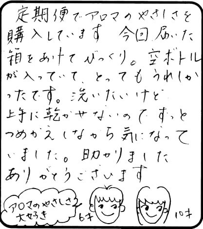 定期便でアロマのやさしさを購入しています。今回届いた箱を開けてびっくり。空ボトル(※詰替用のためのものです)が入っていて、とても嬉しかったです。洗いたいけど上手に乾かせないので、ずっと詰替えながら気になっていました。助かりました。ありがとうございます。アロマのやさしさ大好き。