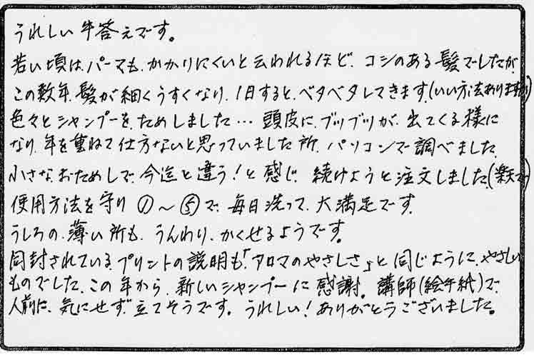 50才を過ぎた頃から髪がヤセ、パサパサで全くセット力がなくなり、ガックリしていました。あきらめていた頃、こちらのス用品に出会い、今までのパサつきがウソのようにしっとりしてきました。都市のせいだと思っていたのに、うれしく思いました。「アロマのやさしさ」のシャンプーはこれからもずっと愛用していきたい商品となりました。本当にありがとうございました。