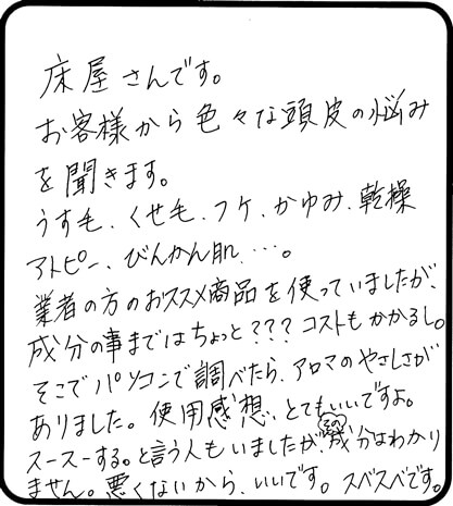 床屋さんです。お客様から色々な頭皮の悩みを聞きます。うす毛、くせ毛、フケ、かゆみ、感想、アトピー、びんかん肌・・・。業者の方のおススメ商品を使いましたが、成分の事まではちょっと??? コストもかかるし。そこでパソコンで調べたらアロマのやさしさがありました。使用乾燥、とてもいいです。スースーする。という人もいましたが、その成分はわかりません。悪くないからいいいです。スベスベです。