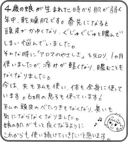 4歳の娘が生まれた時から肌が弱く、年中乾燥肌です。春先になると頭皮がかゆくなり、ぐじゅぐじゅと生んでしまい悩んでいました。そんな時に「アロマのやさしさ」を知り、1ヶ月使いましたが、痒みが軽くなり、膿むこともなくなりました。